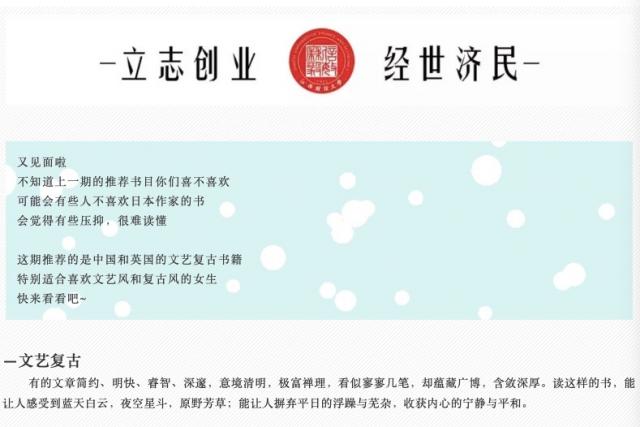 活动前期,首先,女生部内部人员进行讨论和商榷,每个委员都尽其所能地推荐数本不同主题的书籍并给出推荐理由。其后将收集的意见整合,挑选并留下具有代表性和可读性且符合当代大学生喜好的书籍。最后,女生部将整理好的书目和材料交由院网新办进行修改并在麻豆a片 分团委公众号制作推送,希望更多的人能够加入到春日读书的行列。线上活动共有三期,主题分别为:日式清新、文艺复古和人气绘本。第一期的推送“日式清新”的推文主要是介绍一些豆瓣评分较高的日本文学作品,如《明天也是小春日和》、《一个人的好天气》、《遇到百分之百女孩》等,每一篇都会附上内容简介和读者评语,文字细腻而美好,让读者感受到日本特色的文化与文学风格。相信接下来的第二期、第三期也会同样精致,让读者在感受到文学带来的美好的同时,激发同学们春日读书的积极性。