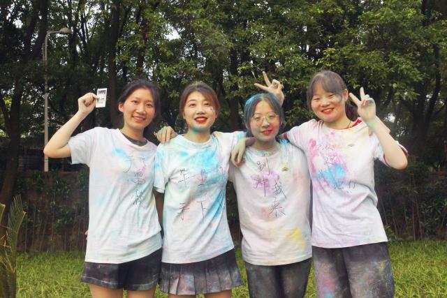 活动正式开始前,麻豆a片 宿管部下至各寝宣传本次活动,并统计参加活动人数以准备活动物资。活动当天下午,同学们在篮球场集合,在确保学生安全卫生的前提下,工作人员积极组织同学们换上统一的白色短袖。他们纷纷用马克笔在衣服上签下彼此的姓名或是写下对未来的期望和祝福。本次活动使用了青、红、白、黑、黄五种颜色的五谷粉末,象征同学们五彩斑斓的青春,在工作人员向在场同学喷洒红色彩虹粉后,活动正式开始。同学们均跃跃欲试,纷纷用彩色的粉末进行创意涂鸦,借此给大学生活留下一个缤纷多彩的纪念。在游戏中,有的同学相互追逐喷洒粉末,尽情释放着青春活力;有的同学喷绘出“经济”二字,表达对学院的深情;有的同学看到对方满身彩色哈哈大笑,拍照纪念这份洒脱和美好……在夕阳的余晖下,篮球场的一角充满了欢声笑语,工作人员使用相机和“拍立得”将这些快乐的记忆定格成永恒,并把照片送给在场同学。最后,本次活动以五颜六色的衣服和面对镜头的笑脸画上句号。