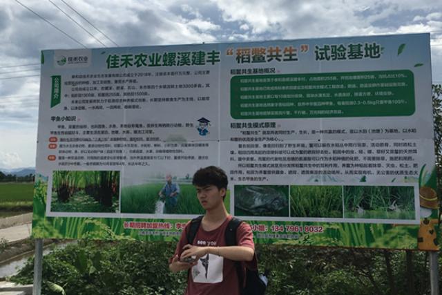 7月4日下午,一辆客车缓缓驶入螺溪镇。首先,同学们参观了当地的特色产业基地。通过参观稻虾、稻鳖共生养殖,同学们对村民土地流转的相关问题有了初步认识。据相关负责人员表示,稻鳖共作采用了“公司+农户”的模式;统一技术、统一收购不仅极大地利用了当地的自然环境优势,更解决了村民养殖的后顾之忧,同时也保护了当地的生态环境,而大棚则引进了精准滴溉的模式。