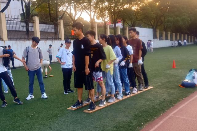 走进田径场,首先看到的是迎面跑来的接力赛成员,尽管头发已被汗水打湿,目光却依旧坚定,表情却更加坚毅。走进几步,便听见训练有轨电车的同学们“一二,一二”的口令声,时而凌乱的步伐并不能干扰他们掷地有声的口号,更无法撼动他们的从容与耐性。来到绿草地上,就看见30米龙卷风项目的同学们紧张而又激烈地进行着训练,冲刺时,同学们步伐整齐,速度一致;过杆时,同学们配合默契,沉稳迅速;起跳时,同学们动作敏捷,冷静镇定。与龙卷风的紧张激烈截然不同的是旁边同心鼓的训练,同学们个个沉着冷静,屏息凝神,专注于球的移动。宿舍楼下,啦啦操方队的动作整齐划一,洋溢着青春的活力;塑胶跑道旁,不倒森林的同学们有条不紊,宣示着青年人的专注;绿茵草地上,袋鼠跳的同学们拼尽全力,展示着他们不服输的精神…