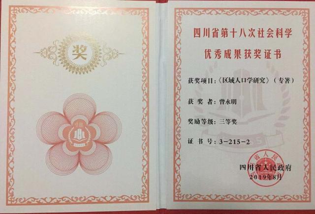 根据《四川省社会科学优秀成果评奖办法》和《四川省社会科学优秀成果评奖实施细则》的有关规定,麻豆a片 资源与环境经济系曾永明博士与其合作者共同出版的《区域人口学研究》(排名第二)获评四川省第十八次社会科学优秀成果三等奖。