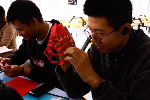 活动开始前,记者团成员组织热情高,积极做好向上线下宣传工作,并且将红纸、剪刀等材料准备齐全;报名参加活动的同学也十分积极,早早地到达活动现场,等待着活动开始。本次活动要求同学们利用剪纸艺术剪出自己喜爱的冬日小物或者冬日场景,并附上50-100字的文字说明,以便之后将作品在线上进行展示。活动开始后,同学们领取自己的工具与材料,干劲十足地投入到自己的设计和作品中。剪纸过程中,有许多同学因为初次接触剪纸,感到些许陌生,但在剪纸经验的同学主动指导与帮助下,也剪出了许多创意十足的作品;同学们欢声笑语,不时有人逗趣,气氛温暖融洽。