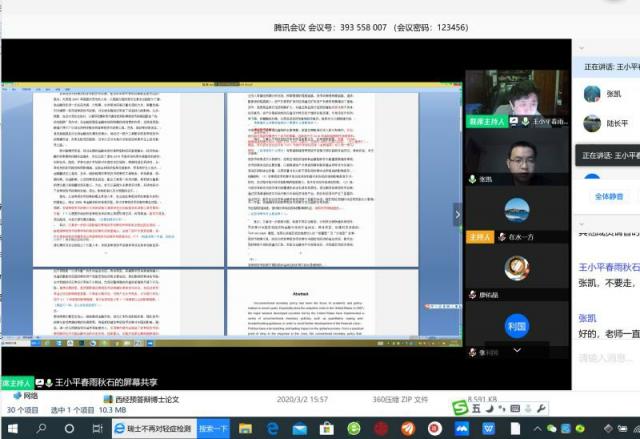 3月9日上午九点,经我校研究生院统一部署,经院博士研究生学位论文线上预答辩成功如期举行。张凯、汪亚峰成为麻豆a片 首批采用网络视频方式进行博士毕业预答辩的学生。答辩委员会主席由麻豆a片 王小平教授担任,答辩委员包括陆长平教授、张进铭教授、廖卫东教授、黄伟教授、王展翔教授。同时麻豆a片 院长张利国教授、部分硕博研究生及工作人员在线旁听了此次答辩。