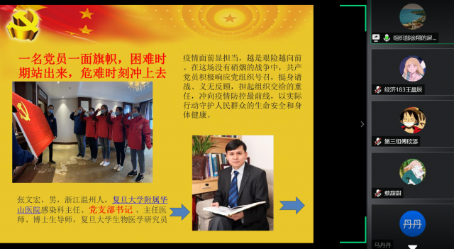 徐翔老师从中国共产党党情入题,以视频、图片等方式体现了共产党员在面对疫情时的担当。同时,徐翔老师截取部分中国共产党党内公报简明阐述了当前中国共产党申请入党情况及党内党员发展状况。