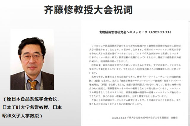 原日本食品系统学会会长齐藤修教授远在日本为本次年会发来贺信:“祝愿大会取得圆满成功,同时期待中日两国从事食品系统研究的学者能够继续深化合作和交流” 。