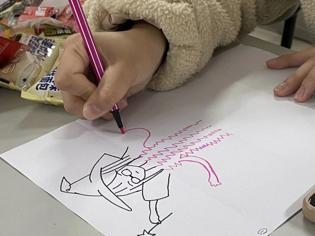 活动开始,负责人组织同学们进行了破冰小游戏——接龙涂鸦。每位同学发一张纸,把每张纸平均折成四份,大家先在各自的第一折画“头”,一分钟后结束绘画,叠好成一折的样子,与其他同学交换画纸,继续接龙画“上半身”、“下半身”和“脚”。同学们充分发挥自己的想象力和创造力,创造出一幅幅形态各异的绘画作品。破冰行动”的开展成功地调动了现场的气氛,同学们减少了最初的陌生,彼此多了一份熟识。