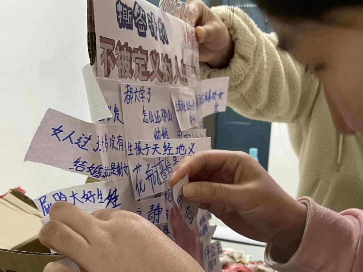 下一个环节,负责人拿出贴满带有刻板印象标签的立牌,鼓励参与活动的同学勇敢撕去标签。同学们纷纷上前,认真看着贴满标签的立牌,仿佛想到了被别人偏见定义的自己,用力撕下写着偏见的标签,并在现场互相交流撕去这一标签的原因。在这个环节中,同学们更好地知道了每个人都是独立的个体,我们都应该坚持做自己,勇敢做自己,不该被他人定义。