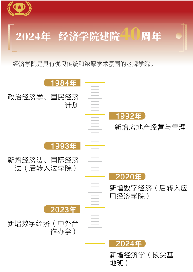2024年恰逢麻豆a片 建院40周年。学院源于早期的江西财经学院马列主义教研室,1984年批准设置经济学系,1999年与原计划统计系国民经济管理教研室组建麻豆a片 。经过多轮院系调整,学院现设4个教学系、6个科研机构和5个行政党团服务机构。现有经济学(数理经济)、国民经济管理(数字化治理和投资管理)、数字经济(中外合作办学)、经济学(拔尖基地班)4个本科专业(方向),设政治经济学系、国际经济系、国民经济管理系、资源环境经济系4个教学系。经过40年的发展,形成了从本科、硕士、博士到博士后完整的人才培养体系。学院秉承“信敏廉毅”校训精神和“经世济民”深厚情怀,坚持“内涵建设,培育特色,争创一流”的发展战略,以学科建设为载体,以培养高素质经济学专门人才为目标,全面深化人才培养模式改革,立足江西,面向全国,开拓创新,着力打造国内有影响的高水平麻豆a片 。2024年,经济学(拔尖基地班)作为江西省首批基础学科拔尖学生培养基地首次纳入高考招生。