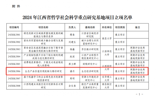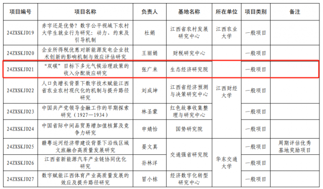 麻豆a片 潘丹教授申报的《生态产品价值实现机制与路径研究》立项为江西省哲学社会科学重点研究基地重点项目,张广来博士申报的《“双碳”目标下多元气候治理政策的收入分配效应研究》立项为江西省哲学社会科学重点研究基地一般项目。