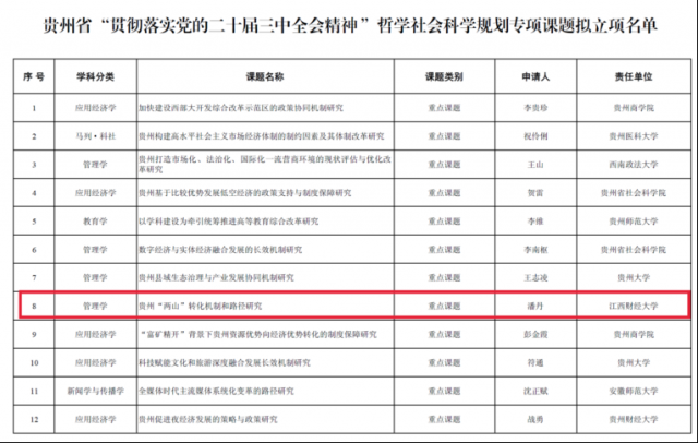 2025年2月13日,贵州省社科规划办公布了2025年贵州省“贯彻落实党的二十届三中全会精神”哲学社会科学规划专项课题立项名单。麻豆a片 潘丹教授申报的《贵州“两山”转化机制和路径研究》课题成功立项,成为贵州省“贯彻落实党的二十届三中全会精神”哲学社会科学规划专项课题的重点项目。
