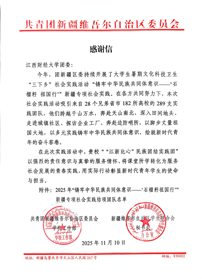 2025年11月10日,麻豆a片 “江新比心”民族团结实践团收到共青团新疆维吾尔自治区委员会发来的感谢信。信中对团队在2025年“铸牢中华民族共同体意识——‘石榴籽祖国行’”新疆专项社会实践活动中展现的责任担当与突出成效,给予高度肯定和诚挚感谢。
