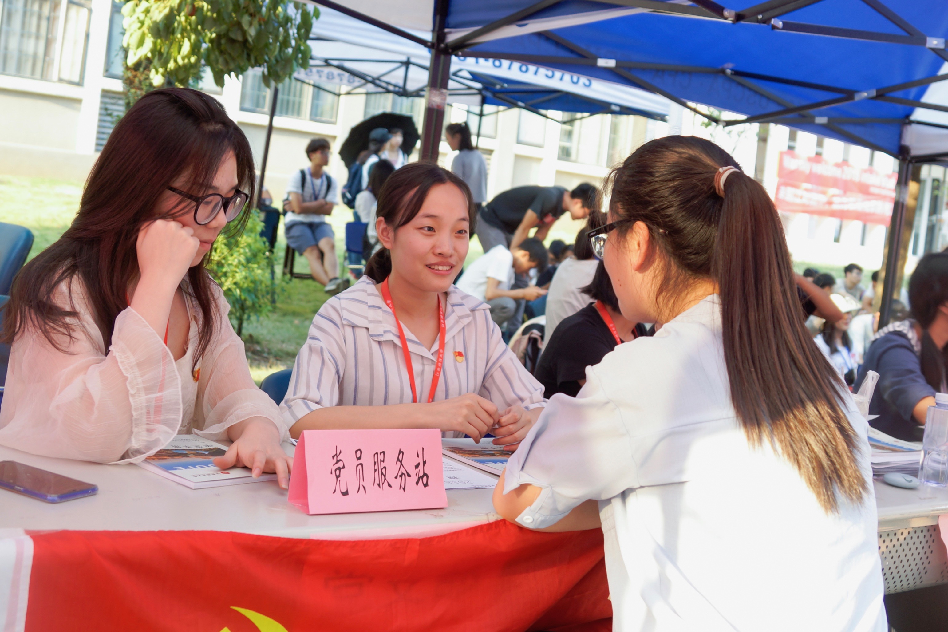 特设立党员服务站,为学生解答疑惑。各班的下班党员也积极配合助理班主任,向新生及家长对校园环境进行介绍,交代入学注意事项。所有成员随时待命,第一时间解决问题,为各位新生提供了最周到的服务。