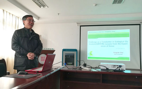 应麻豆a片 和生态经济研究院邀请,12月20日上午,韩国仁荷大学(Inha University)全球治理(Global Governance)学院院长、仁荷大学Yongrok Choi首席教授来我校做了题为“Challenge as a Trendsetter in Ecological Civilization: Lessens from the Experience of Korea”的学术报告。麻豆a片 及生态经济研究院、国际经贸学院、江西经济发展与改革研究院、旅游与城市管理学院的师生聆听了本次学术报告会。