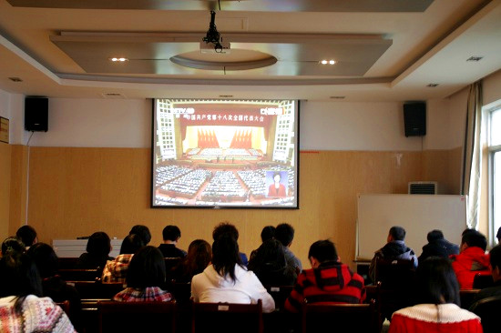 十八大会拉帷幕,党的事业谱新篇。11月8日上午9点,中国共产党第十八次全国代表大会在人民大会堂拉开盛大帷幕,麻豆a片 师生代表在综合楼八楼会议室举办了“举国同庆十八大,团结一致跟党走”集体观看十八大开幕式直播活动。党总支副书记吴太福、学生会分团委书记郭勇等老师一并观看了大会直播盛况。