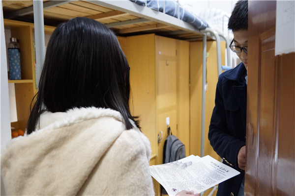 活动当日,委员们在传文社部长的带领下来到麦庐北区宿舍楼。根据活动流程及分工,一部分同学负责分发宣传册,一部分同学负责为同学们解答疑难。在活动过程中,传文社员积极主动的向同学们介绍、讲解所荐书目,并耐心回答同学们对传统文化方面的疑惑。委员们的热情感染了同学,不少同学与委员在走廊、楼道就宣传册上的内容展开讨论,现场气氛热烈。不少同学都表示,传统文化课本让自己了解了许多以前不知道的经典书籍和中国传统文化知识,对于自己以后接触经典读物和扩宽视野很有帮助;传统文化和经典读物在现在仍然有重要价值,自己在今后也会认真学习。