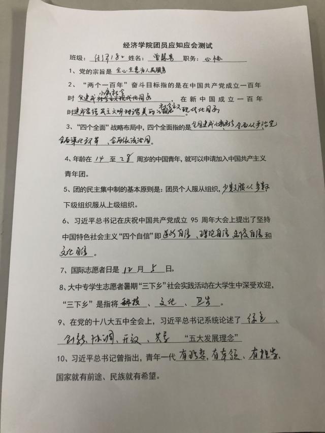 组织团员应知应会测试,不仅促进了学生干部学习理论知识,更提高了他们的文化素养,对于加强经院全体学生的思想道德境界亦大有裨益,同时在学院掀起了学做新风尚。
