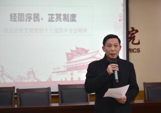 12月4日下午,十九届四中全会精神宣讲团成员罗世华教授为麻豆a片 全体教职工带来了以“经国序民,正其制度”为题的学习宣传贯彻党的十九届四中全会精神宣讲会,宣讲会由党委书记邹春发主持,李大晖、杨飞虎、李国民、胡德龙等60余位老师参加本次宣讲会。