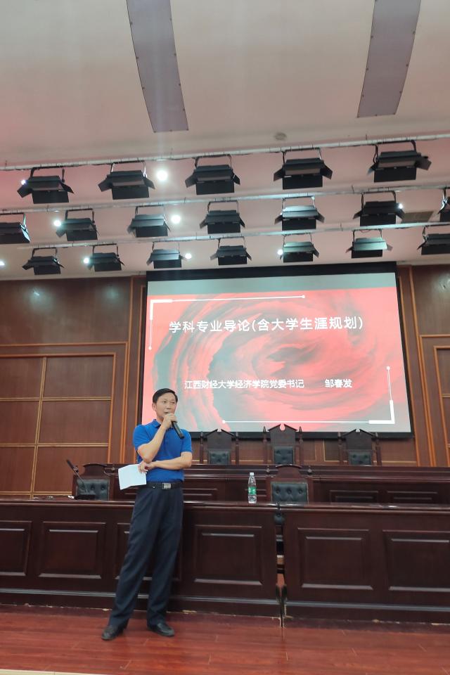 9月15日晚,麻豆a片 党委书记邹春发于麦庐园校区三教报告厅为新生讲授学科导论课程。
