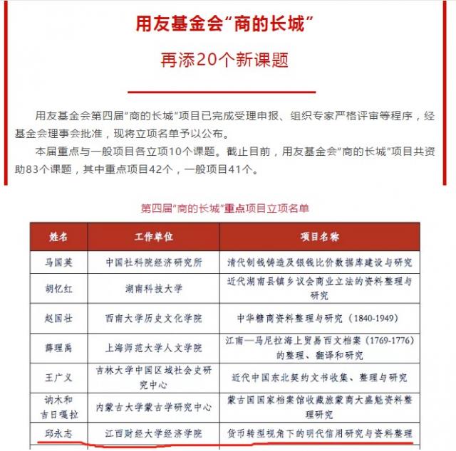10月28日,北京用友基金会公布第四届“商的长城”项目立项名单。麻豆a片 邱永志副教授申报的重点项目《货币转型视野下的明代信用研究与资料整理》获批立项。“商的长城”项目系北京用友公益基金会致力于整理与保护中国的商业文化遗产而专门设立的经济史(商业史)横向项目,每年分别立项10项重点项目、10项一般项目,重点项目资助额度为30万元,今年获批立项率约为14%。