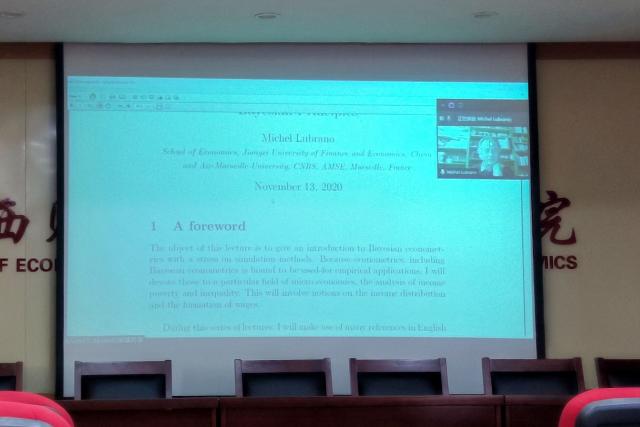 根据教学安排,麻豆a片 于11月11-14日举办了第一阶段外教授课活动。本次活动邀请了法国艾克斯马赛大学Michel Lubrano(米歇尔)教授线上讲授“贝叶斯推断”。活动前麻豆a片 学习部下发通知到各班进行活动宣传,各班同学积极响应。