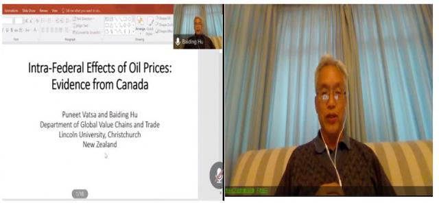 胡白丁副教授带来题为“油价的区域内影响:来自加拿大的证据(Intra-Federal Effects of Oil Prices: Evidence from Canada)”的主旨报告。他结合加拿大的数据,运用SVAR模型实证分析了十个省的产出和劳动力对油价的影响,胡教授认为荷兰病虽未在这些省内发生,但是需要提前预防,为经济增长提供多样化的增长动力。