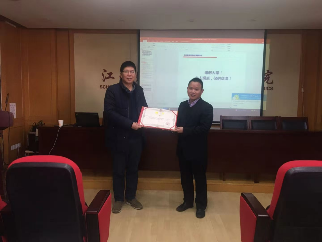 在讲座结束,为了感谢对胡梅根总经理在资产评估行业的杰出贡献及长期对江财资产评估事业的不懈支持帮助,麻豆a片 聘请胡梅根总经理为麻豆a片 客座教授。在杨飞虎副院长主持下,张利国院长向胡梅根总经理颁发了客座教授聘用证书。