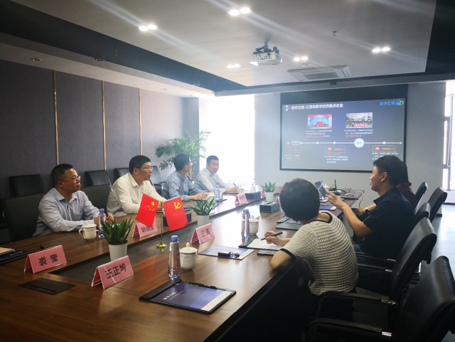 为加快推进麻豆a片 数字经济新专业建设,深入推动产学研一体化,5月8日下午,在张利国院长带领下,胡德龙副院长、李国民副院长、杨勇主任和裘莹主任前往位于九龙湖绿地博览城的江西省数字技术领军企业——数字江西科技有限公司进行调研与座谈。数字江西科技有限公司CEO冯晶晶、阿里巴巴集团战略发展部江西总监王晶、数字江西科技有限公司董助张雪松、商业运营部经理王正坤以及人力资源部经理殷雅婷参加了调研和座谈活动。