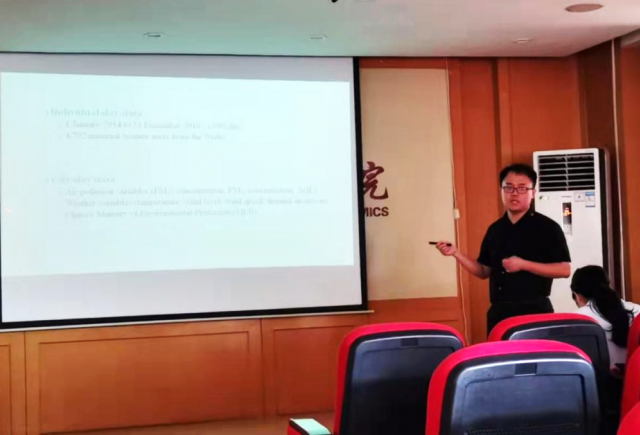 张广来博士汇报的论文主题是“The Happiness Science of Air:Pregnant Women Suffer Sentimentally for Ambient Air Pollution in China”。该研究追踪了4729名女性怀孕前后在新浪微博中发布的微博情感内容,并采用机器学习算法对微博内容进行文本分析与计算,以了解空气污染情况对孕产妇情绪的影响。研究表明,在使用大气“逆温”作为空气污染的工具变量后,空气污染对母亲的情绪水平造成显著的负面影响。其中,PM2.5浓度每增加1个标准差,孕产妇情绪值降低0.04个标准差。同时,该研究还发现此负向影响随着婴儿和母亲的不同特点(婴儿性别、体重和孕妇生产方式)而具有异质性。该研究强调在孕妇人口普查数据有限且气候外部效应明显的发展中国家,以社交媒体数据对孕产妇情绪进行评估是一种新的替代方法,研究结论对推动女性健康关注、环境污染管控具有重要意义。