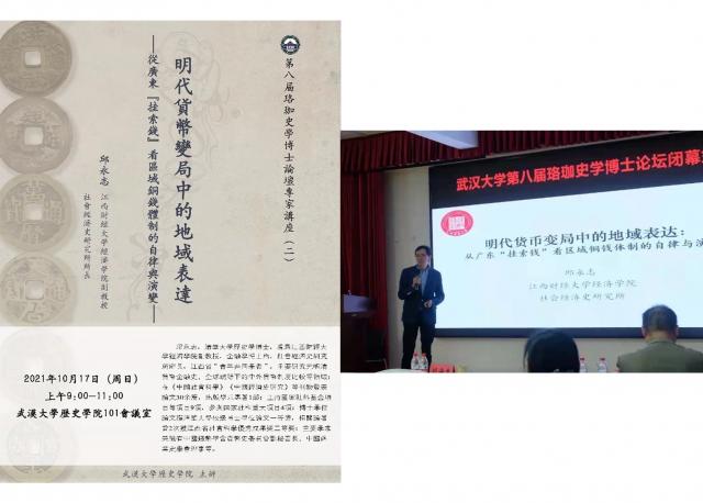 2020年10月17日,应武汉大学历史学院副院长杨国安教授的邀请,我院邱永志副教授赴武汉大学大学历史学院开展题为“明代货币变局中的地域表达——从广东‘挂索钱’看区域铜钱体制的自律与演变”的专题讲座,并参与了该院主办的“武汉大学第八届珞珈史学博士论坛”闭幕式,讲座由杨国安教授主持,现场共计有数十位院内外教师和研究生参加。讲座内容是邱教授最新的研究成果,该讲座以明代中叶广东出海口地区“挂索钱”的衍生、自律存在为例,透视国内外铜钱体制所呈现的同步自律与演变状况。