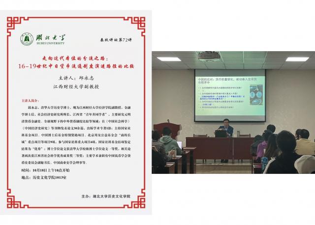 18日,应湖北大学历史文化学院历史学系主任张宁教授的邀请,邱教授赴湖北大学历史文化学院开展学术交流活动。活动分为两个阶段,第一阶段历史文化学院的领导、青年教师代表与邱教授就学科发展、青年学者成长、论文写作与发表等话题展开座谈,第二阶段邱教授开展了题为“走向近代本位的分流之路——16-19世纪中日货币流通制度演进路径的比较”的专题讲座,讲座由张宁教授主持,现场有该院几十位的师生参与讲座。讲座内容以邱教授发表在《中国社会科学》关于近世中日货币制度比较研究的论文为主体,加入一些最新的思考心得。