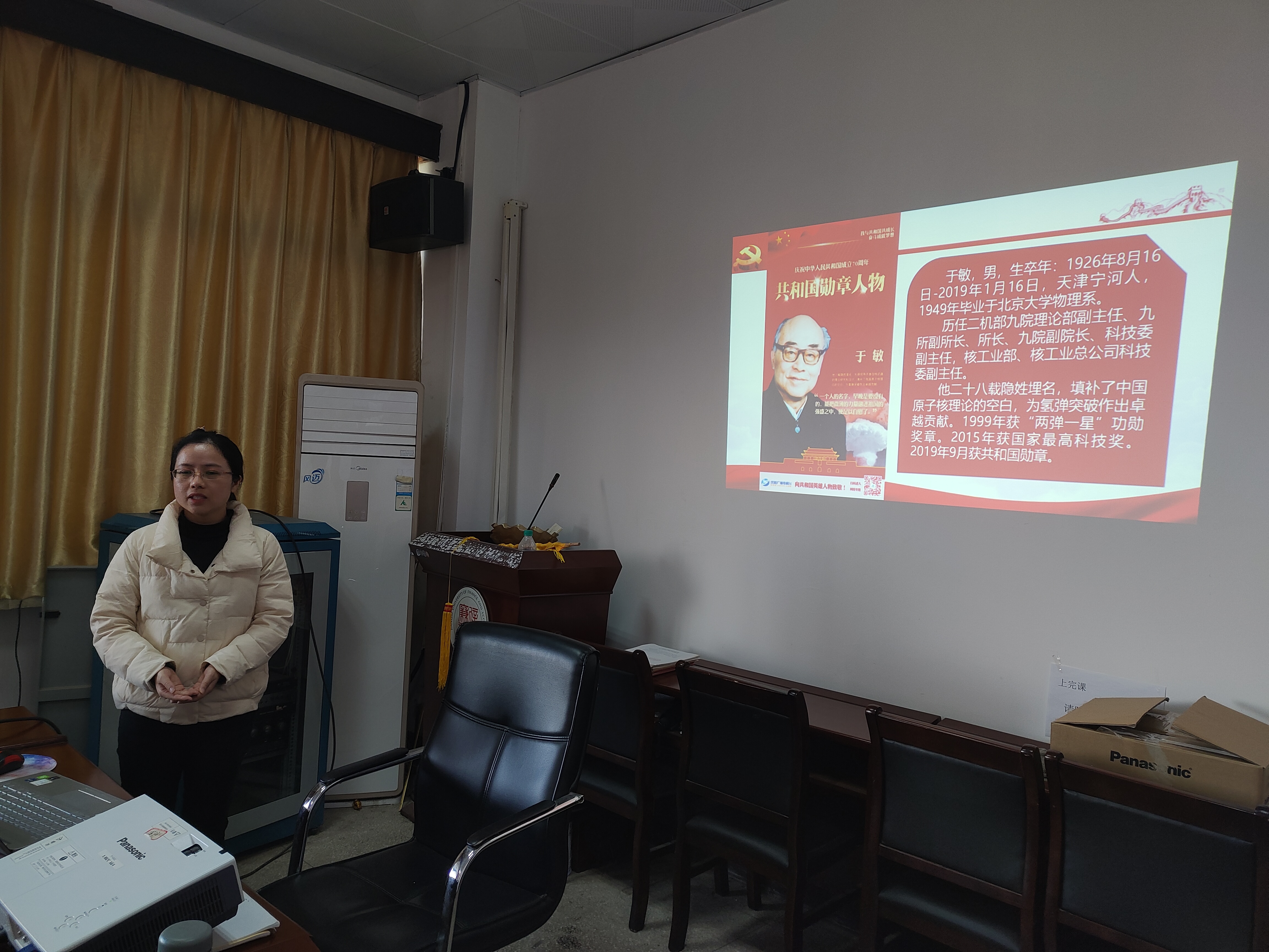 会上,新入职教师汪小芹同志结合“两弹一星”精神,讲述了“中国氢弹之父”、共和国勋章获得者于敏的故事。汪小芹透过“两弹一星”研制的国际国内历史背景,分析了核弹科学家团队如何在极其艰苦的条件下,克服重重困难、勇攀科学高峰、不争名利、默默奉献的精神。为“两弹一星”研制做出巨大贡献的科学家们不仅是时代的英雄,也是新时代党员的先锋模范。