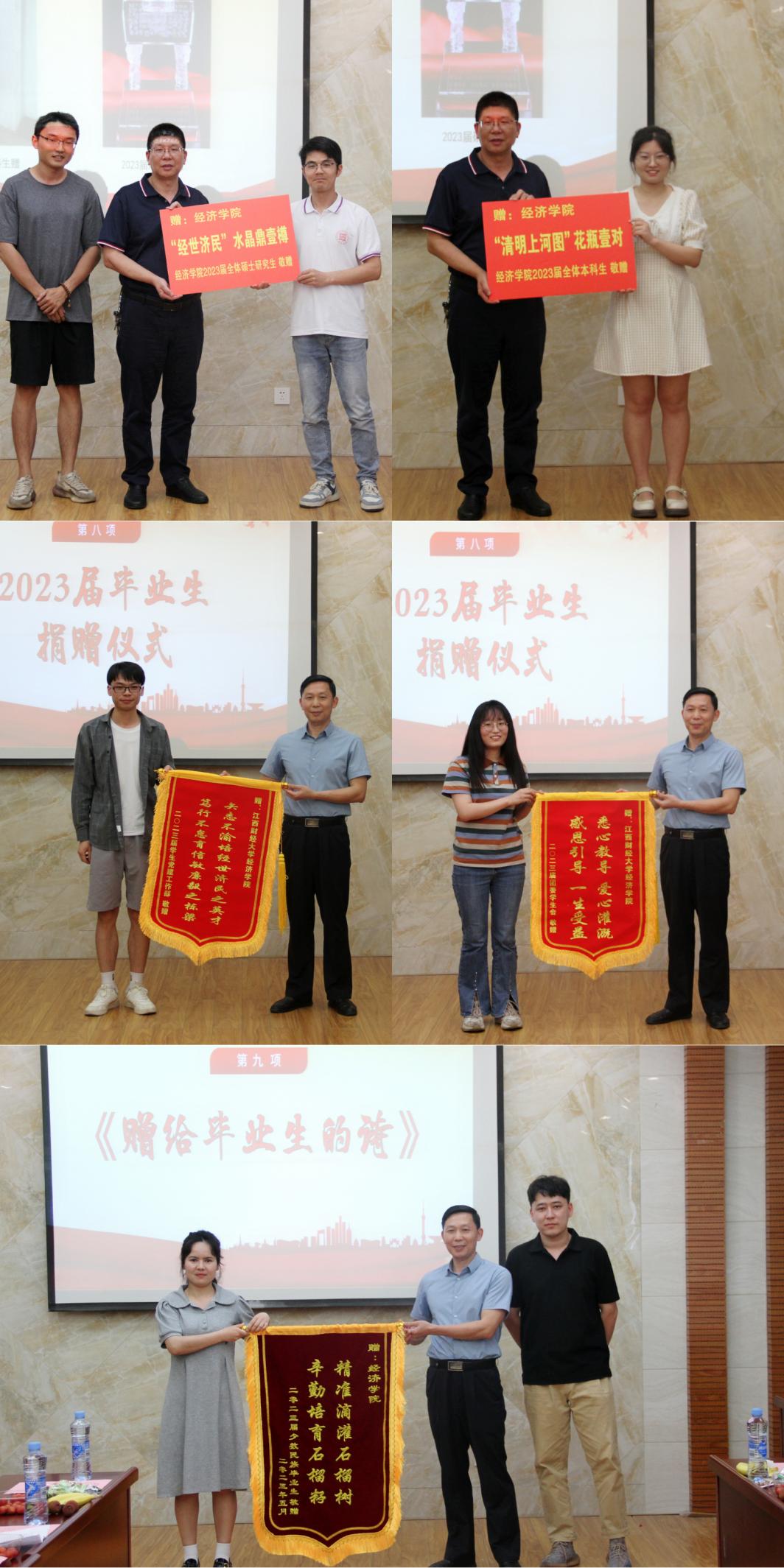 毕业生分别向学院捐赠了“经世济民”水晶鼎、“清明上河图”花瓶和锦旗作为留念,祝福学院事业鹏程万里,更加辉煌!