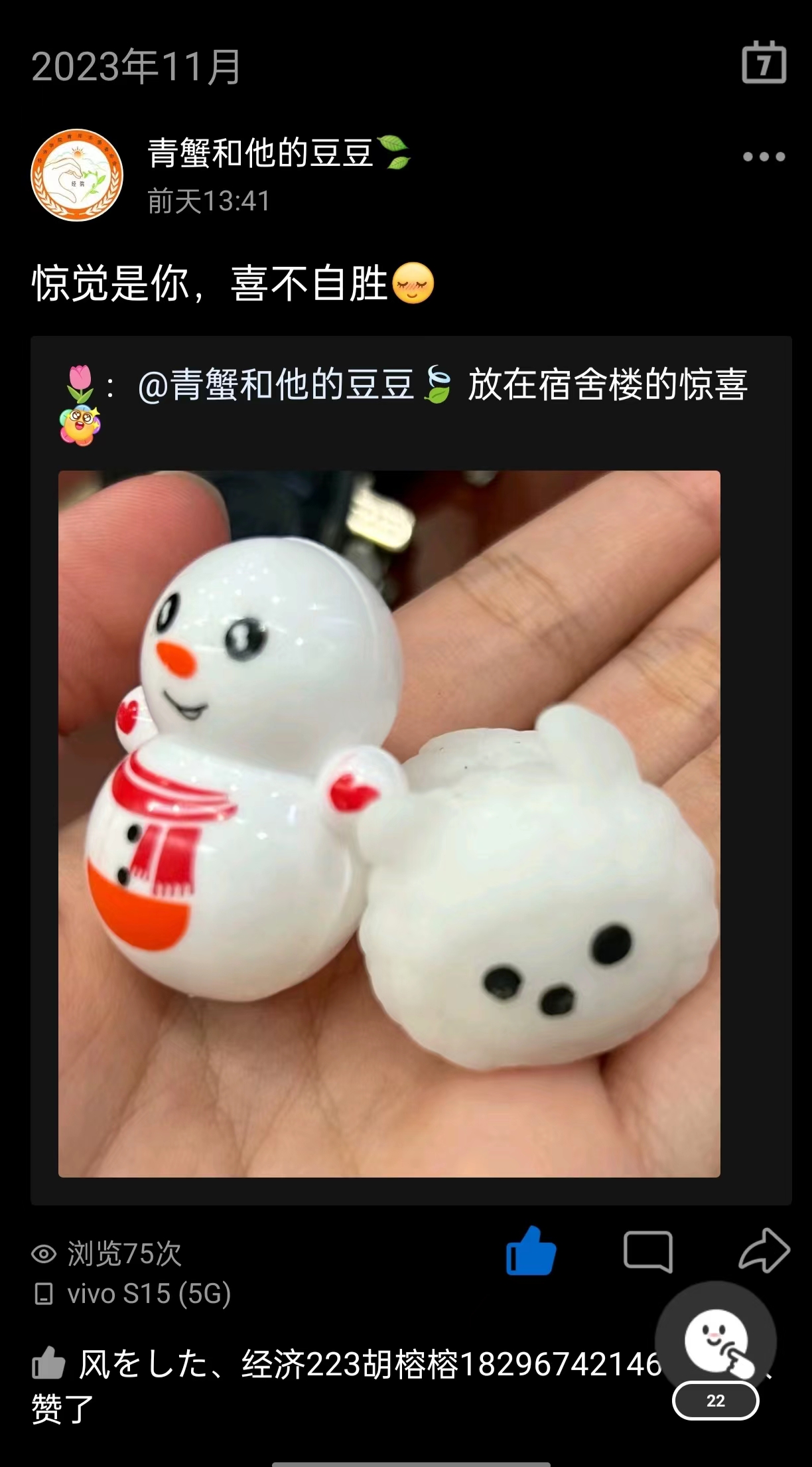 活动过程中,同学们纷纷加入寻宝队伍,积极寻找并带走这些可爱的小礼物,这些礼物包括捏捏乐小动物、爬墙蜘蛛人、不倒翁玩具以及糖果等。同学们寻宝“小惊喜”成功后进行拍照留念,上传至QQ空间进行转发,分享今天遇见的趣事和收获小礼物的感受。