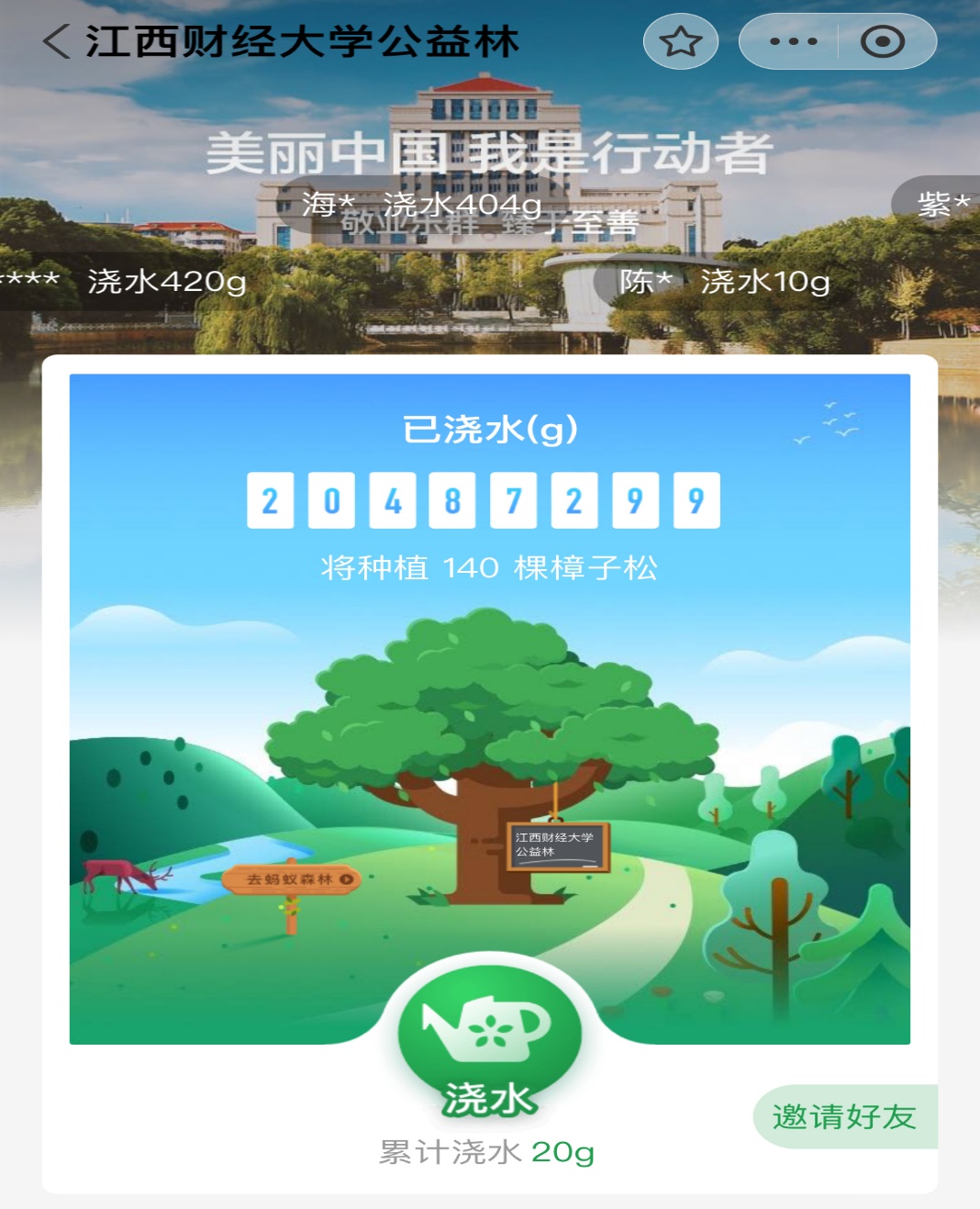 活动伊始,同学们需要通过支付宝的【蚂蚁森林】功能完成浇水20g及以上的任务,参与人数众多,展现了大家想要参与活动的热情。
