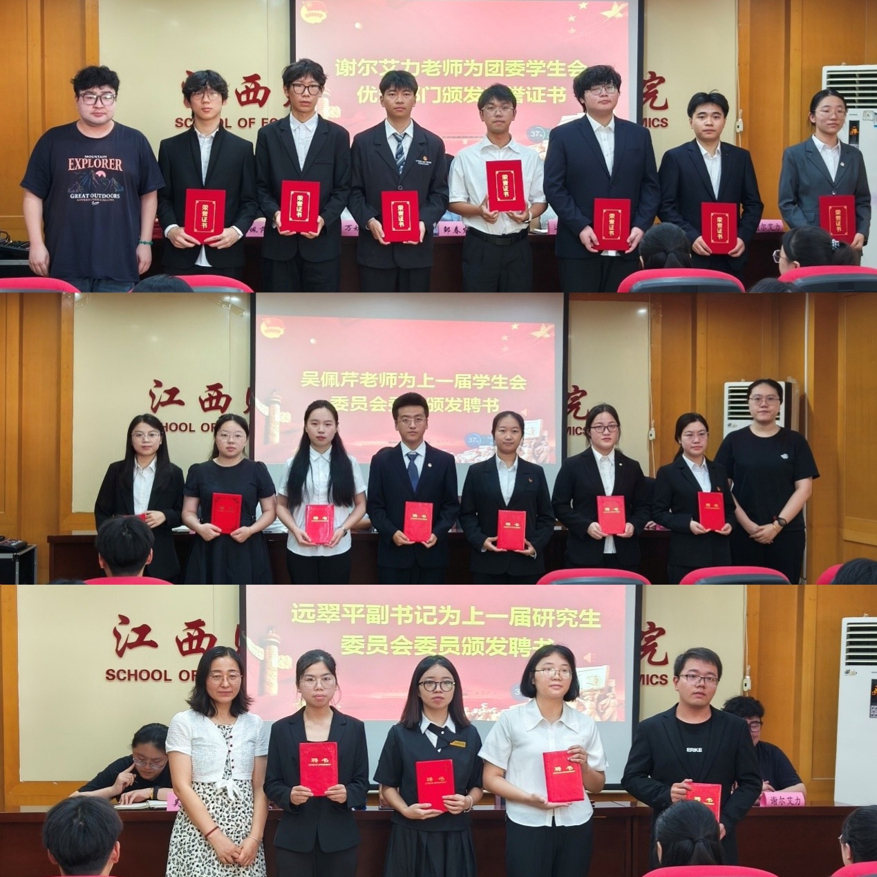 谢尔艾力老师为团委学生会优秀部门颁发荣誉证书,吴佩芹老师、远翠平副书记分别为上一届学生会委员会委员、上一届研究生委员会委员颁发聘书。