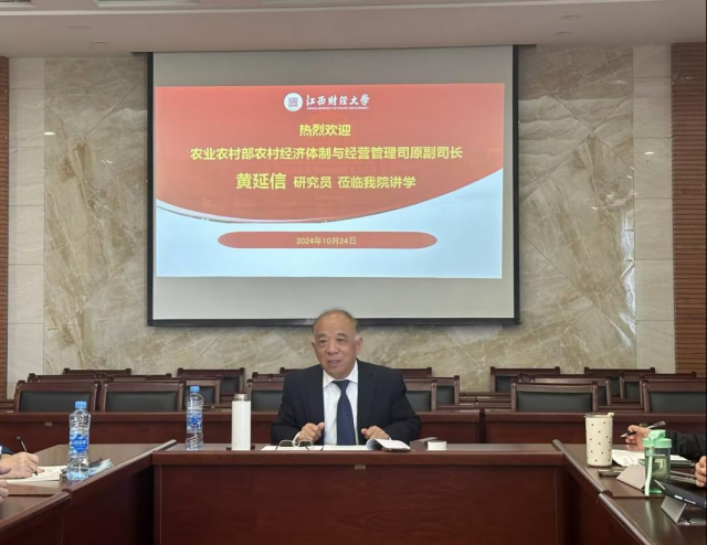 10月24日下午,农业农村部农村经济体制与经营管理司原副司长黄延信研究员受邀莅临麻豆a片 讲学,作了以“深化农村改革若干问题”为主题的学术报告,讲座由生态经济研究院院长潘丹教授主持,院长张利国、中国农业农村现代化研究院院长周应恒教授等院内外50余师生参加。