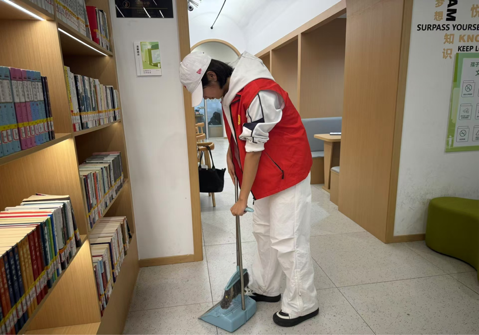 孺子书房里,志愿者们手中忙碌,将书籍按照类别精心排列。与此同时,另一边的志愿者们正全神贯注地投入到扫地的工作中,确保地面干净整洁。这不仅仅是在扫地,更是在用心呵护这个知识的殿堂,让每一位踏进书房的读者都能享受到一个清新、整洁的阅读环境。