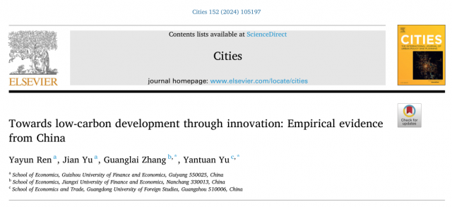 2024年9月,张广来老师以共同通讯作者在城市经济领域权威期刊Cities发表题为《Towards low-carbon development through innovation: Empirical evidence from China》的研究成果,揭示了创新城市试点政策对城市低碳发展的影响机制。Cities(经济学SSCI一区期刊)是城市研究领域的高影响力国际权威学术期刊,旨在发表城市规划、城市发展和政策等领域的高质量理论与实证论文,影响因子为6.0,该期刊连续多年在城市研究领域国际核心期刊排名前3,也属我校国际权威B+期刊。