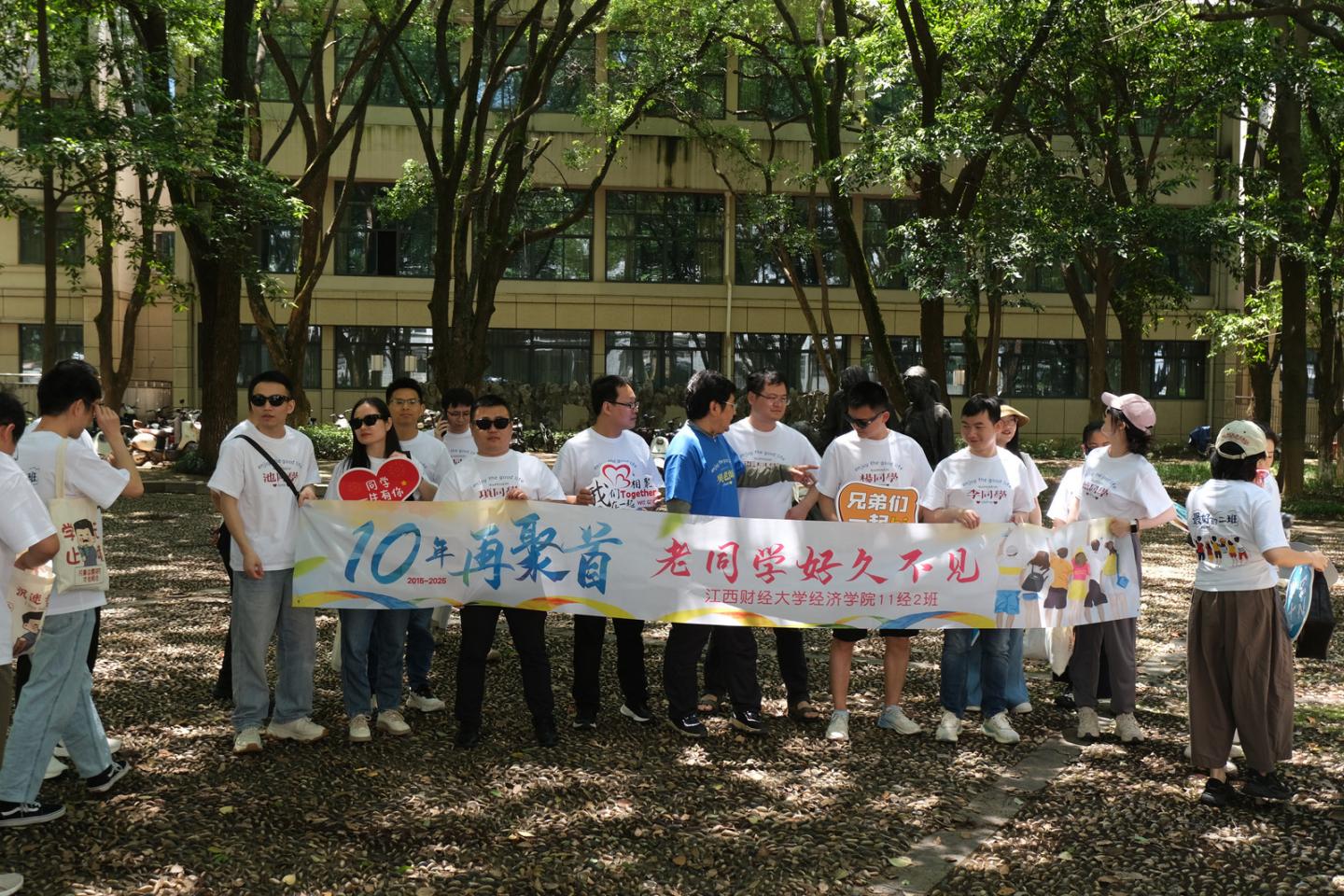 座谈会后,师生携手漫步校园,重访教学楼、食堂、操场等承载记忆的角落,在蛟湖畔、晨读广场、科瑞文博馆合影留念。十年之约终相聚,聚首归来尽欢颜!