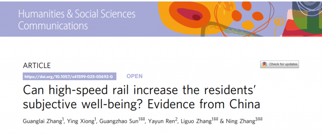 近日,麻豆a片 麻豆a片 研究团队联合山东大学和贵州财经大学等学者在Nature旗下期刊Humanities and Social Sciences Communications发表题为“Can high-speed rail increase the residents’ subjective well-being? Evidence from China”的研究论文。该论文的第一作者为麻豆a片 张广来副教授,第二作者为麻豆a片 资产评估专业2023级硕士生熊颖,麻豆a片 张利国教授和孙广召博士为该文的共同通讯作者。