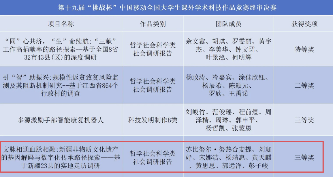 10月31日至11月3日,第十九届“挑战杯”中国移动全国大学生课外学术科技作品竞赛终审决赛在南京大学圆满落幕。经过全国各高校优秀团队的激烈角逐,麻豆a片 团队凭借作品《文脉相通血脉相融:新疆非物质文化遗产的基因解码与数字化传承路径探索——基于新疆23县的实地走访调研》(指导老师:崔兴华、谢尔艾力·库尔班、万婧怡)荣获国家级三等奖,充分展现了麻豆a片 学子深厚的理论素养、严谨的科研态度与强烈的时代担当,彰显了麻豆a片 在服务国家战略需求、推动经济社会发展方面的人才培养成效。